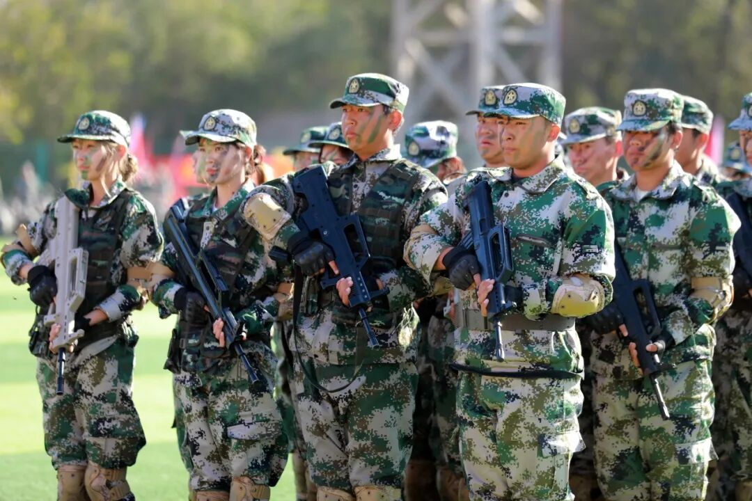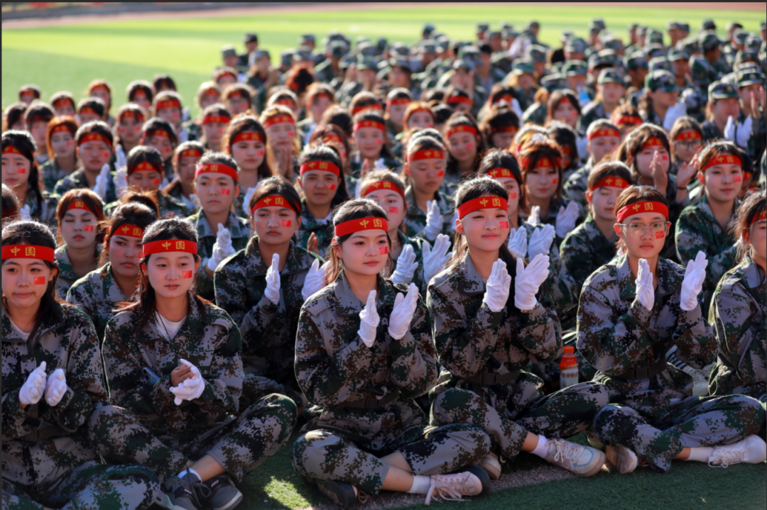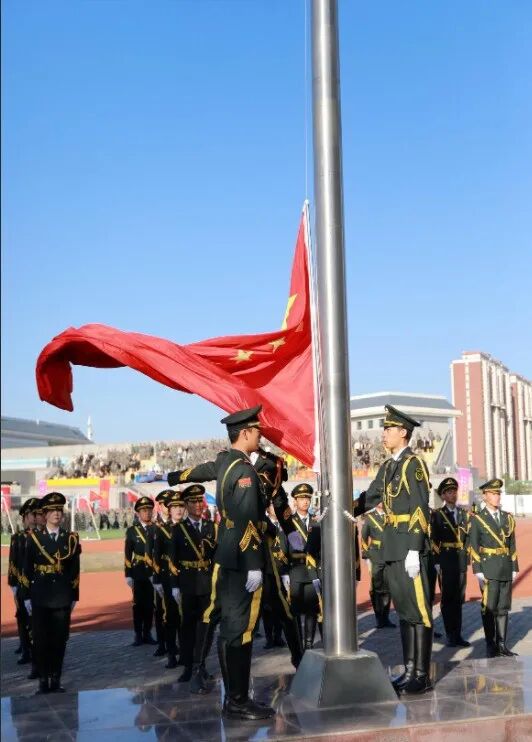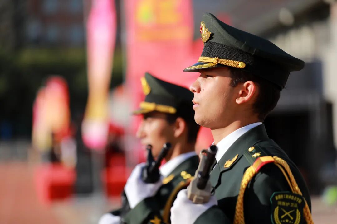 当国旗护卫队迈着铿锵正步护卫国旗入场,全场肃立。《义勇军进行曲》奏响,千余名新生目光紧追那抹鲜红攀升。这一刻,国旗映着迷彩,信仰照亮青春,校园的上空激荡着新时代青年的使命担当。