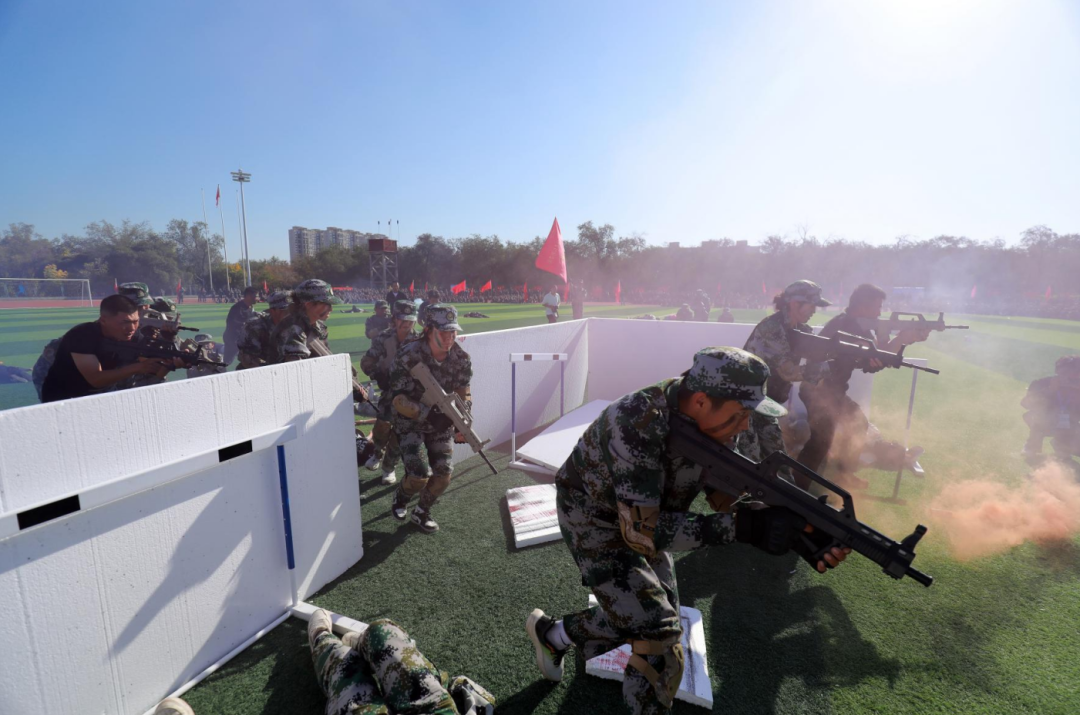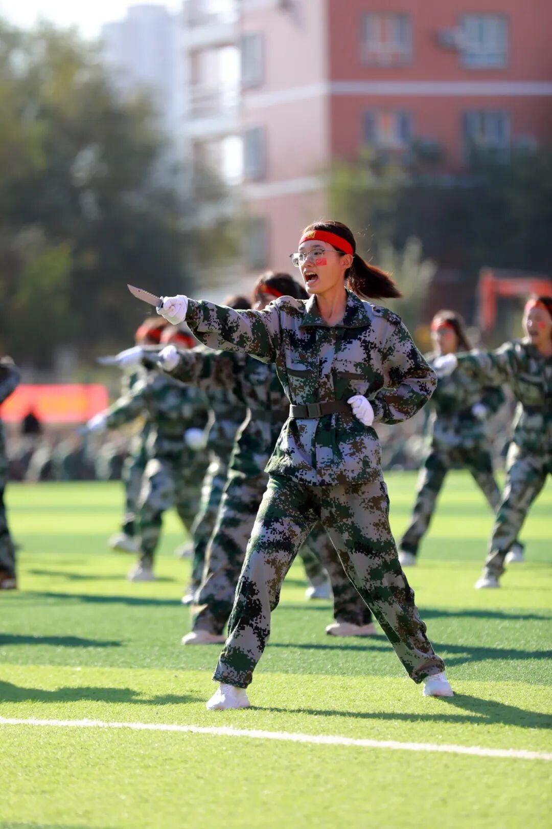 队列会操中,学子们军姿标准、转体利落,尽显纪律之美;匕首操队员手持匕首,刺、劈、挑、挡动作凌厉,寒光中透着坚毅;军体拳一招一式刚劲有力,拳风里满是青春锐气;旗语操队员挥旗如舞,红黄旗帜传递指令,默契十足;战术对抗演练更还原“硝烟战场”,学子们匍匐前进、交替掩护、快速突击,动作娴熟如实战,尽显“敢打必胜”的军人风采。每一个项目都是意志与纪律的淬炼,每一滴汗水都凝结成青春的勋章。