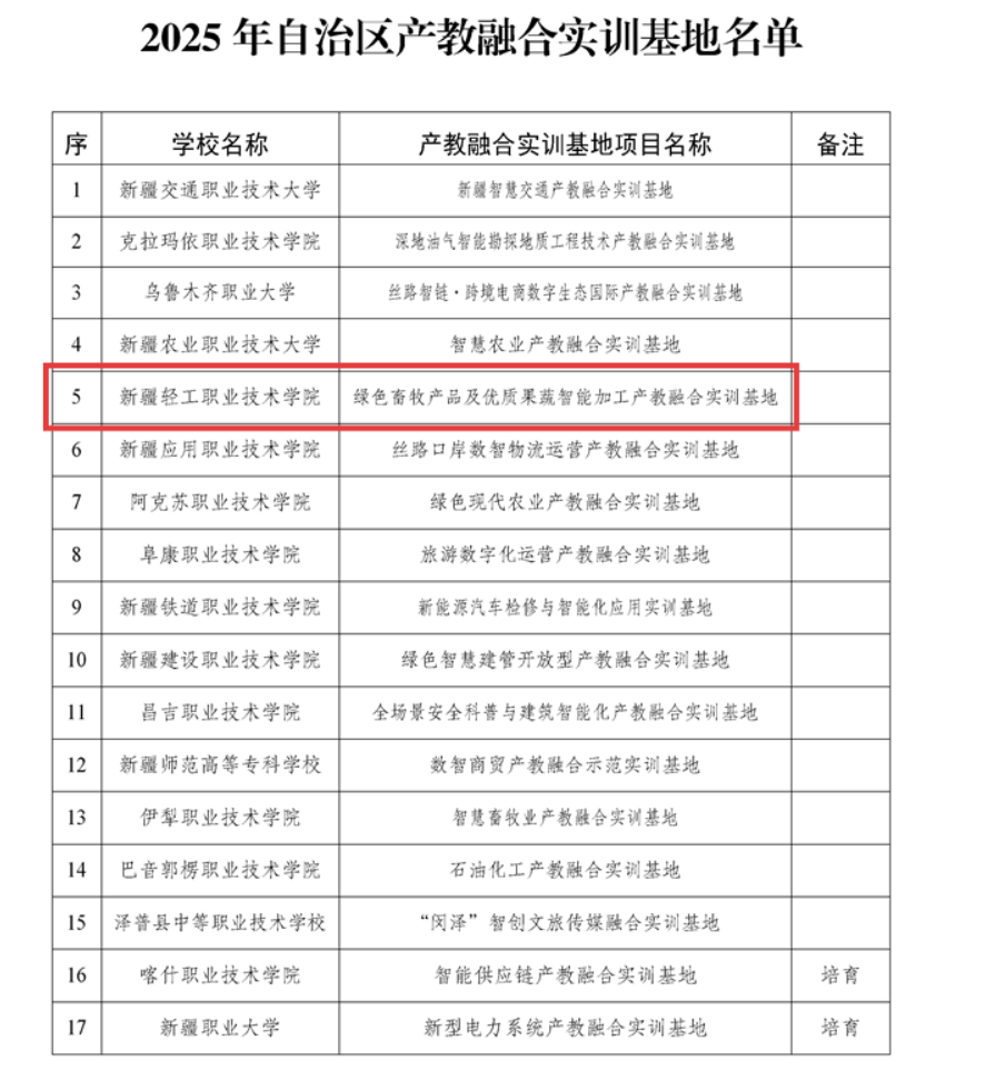 近日,自治区教育厅公布了第三批产教融合实训基地名单,我校绿色畜牧产品及优质果蔬智能加工产教融合实训基地成功获批。