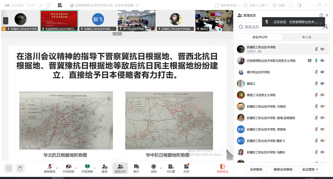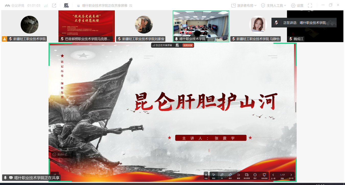 为扎实推进大中小学思政课一体化建设,落实立德树人根本任务,将伟大的抗战精神有机融入思政育人实践,近日,由我校马克思主义学院牵头,联合喀什职业技术学院、巴音郭楞职业技术学院、喀什理工职业技术学院共同举办的“抗战历史我来讲”大学生思政课线上展示活动顺利举行。学校党委委员、副书记杨清香,喀什理工职业技术学院副院长李新出席活动。