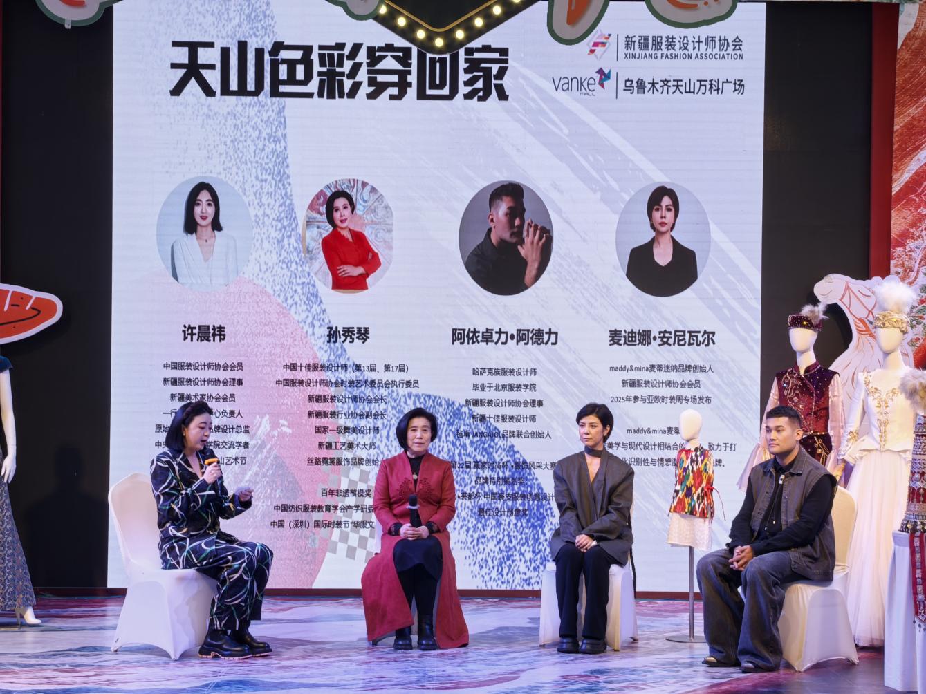 沙龙汇聚了众多设计领域的杰出代表。中国十佳时装设计师、丝路霓裳品牌创始人孙秀琴,北京一行一线产品中心负责人、原始雪物滑雪服设计总监许晨祎,新疆十佳服装设计师、毡卓品牌联合创始人阿依卓力·阿德力,以及《maddy&mina麦蒂迷纳》品牌创始人麦迪娜·安尼瓦尔等行业领军人物,围绕“艾德莱斯绸的当代转译”“草原民族色彩图谱的时尚化表达”“非遗元素与国潮设计的融合路径”等内容,展开深度分享与思维碰撞。他们不仅讲述创作故事,更通过实际案例展现如何将新疆深厚的文化资源转化为“可穿行的艺术”,赋予传统以年轻的生机。