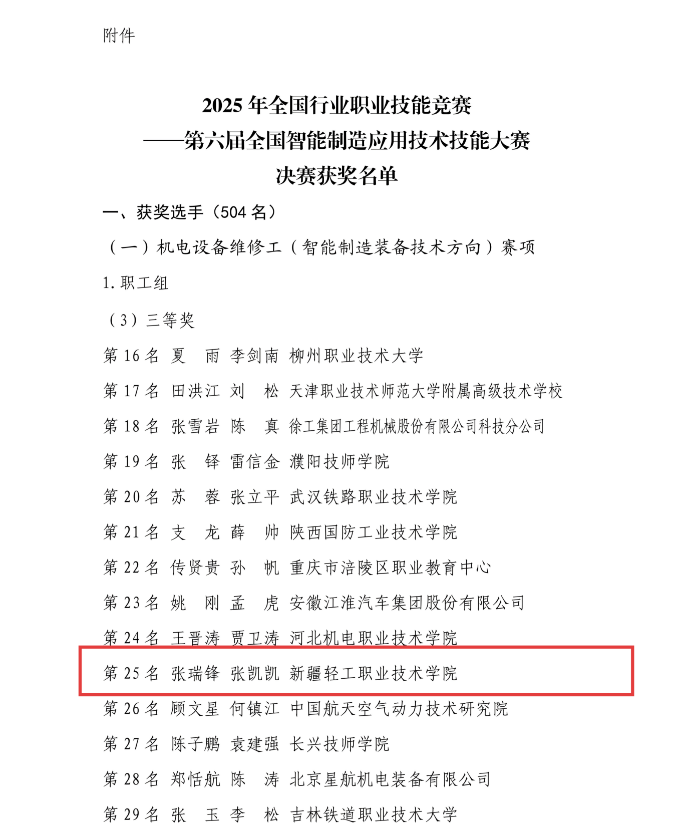 近日,由中国机械工业联合会、人力资源社会保障部、中华全国总工会共同主办的“2025年全国行业职业技能竞赛——第六届全国智能制造应用技术技能大赛”决赛获奖名单揭晓。我校智能制造学院教师张瑞锋、张凯凯组成的参赛团队,在“机电设备维修工(智能制造装备技术方向)”赛项中表现出色,荣获职工组三等奖,在全国高职院校中展现了精湛的技能水平和良好的职业素养。