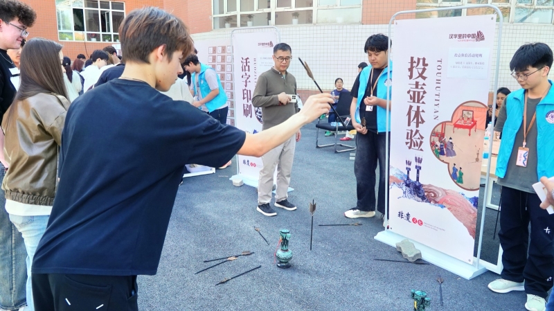 活动以汉字形态演变为脉络,融合“六艺”实践打造沉浸式传统文化场景,设置活字印刷、投壶、捶丸等多个互动板块。师生在拓印诗词、趣味挑战中收集字卡,完成“古今对话”配对积分,在欢声笑语中深化对古文字的认知,现场气氛热烈,参与热情高涨。
