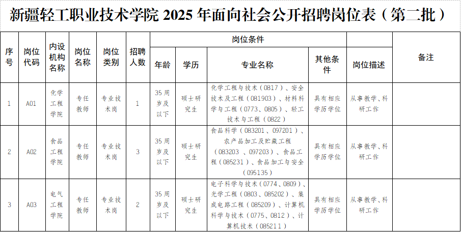 根据《事业单位人事管理条例》(国务院令第652号)、《自治区事业单位面向社会公开招聘工作人员办法》(新人社发〔2013〕141号)等有关规定,2025年新疆轻工职业技术学院面向社会公开招聘工作人员(第二批)40名。现将具体事宜公告如下: