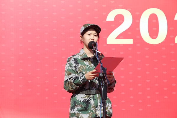 食品工程学院学生王雨婷代表参训新生发言。她承诺将在接下来的军训里严格要求自己,自觉接受军训考验,戒骄戒躁、吃苦耐劳,并号召同学们勇立潮头,不断奋进,在中华民族伟大复兴之路上勇于担当重任。