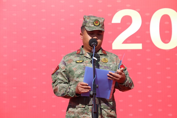 高振飞代表全体军训教官发言。他表示将严格按照军训要求,认真履行教官职责,科学组训施训。他希望全体新生在训练中严守纪律、听从指挥,严于律己、关心集体,并勉励大家要强化国防意识,提升国防素养,增强国防观念,培塑家国情怀,用实际行动交出一份自己满意的答卷。