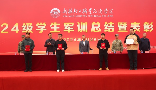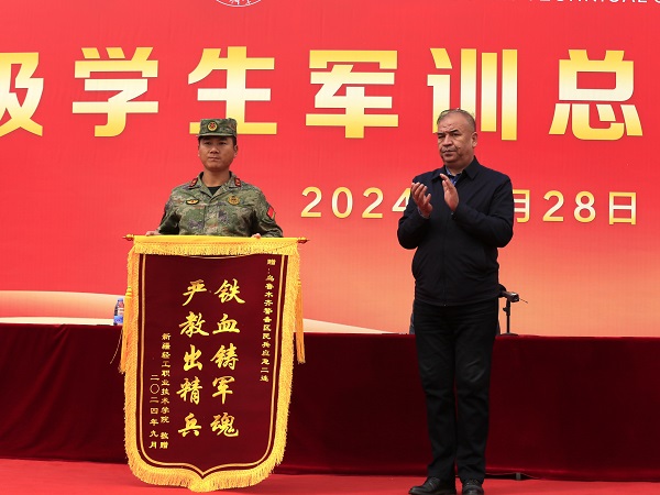 荣光闪耀表彰时,共庆军训硕果丰。学校党委委员、副院长亚力坤·马木提宣读表彰决定。与会领导为军训工作先进单位、先进集体、优秀教官、先进工作者、军训标兵颁奖。军训标兵代表王越、优秀教官代表何佳昊分别发言,分享此次军训的收获和感悟。