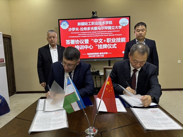 10月15日,郭江副院长率团来到撒马尔罕国立大学进行交流访问。双方就如何进一步加强留学生培养和科研合作进行深入交流,并在人才培养、科研合作、互派学生、联合办学等方面达成合作共识,签署了合作备忘录,并举行了“新疆轻工职业技术学院驻撒马尔罕国立大学中文+技能培训中心”挂牌仪式。