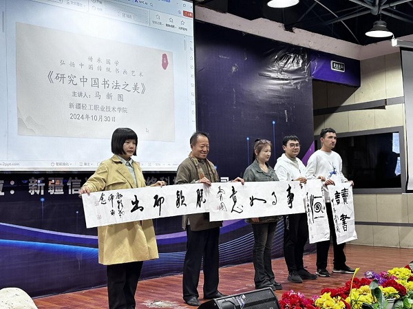 为弘扬中华优秀传统文化,丰富校园文化艺术生活。10月30日下午,应学校数字媒体学院的邀请,新疆书法家马新图在北校区实训四楼为广大师生带来了一场以《研究中国书法艺术之美》为主题的精彩讲座,数字媒体学院党总支书记代莉主持讲座。学院近300名师生代表现场观摩聆听,共享文化盛宴。