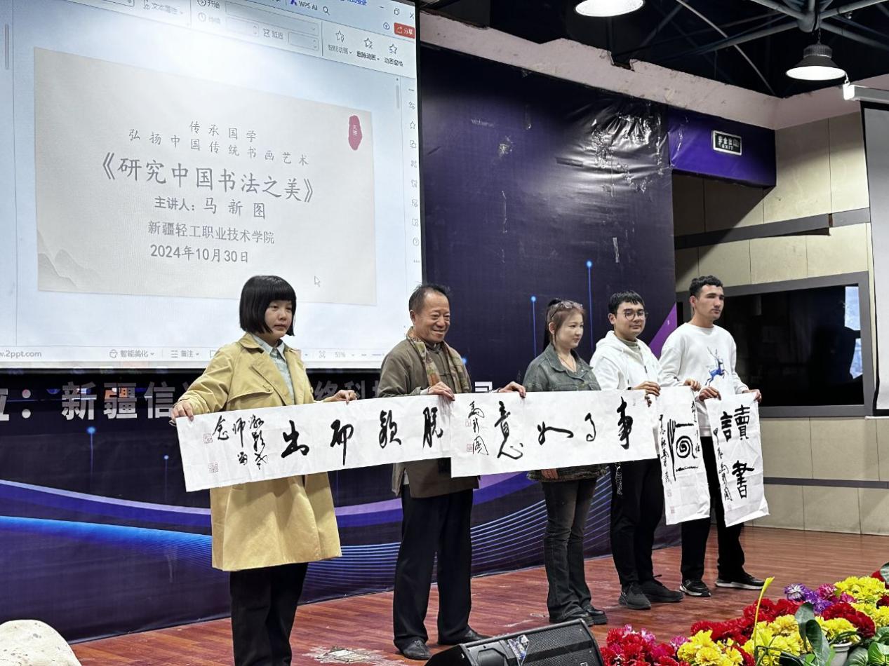 为弘扬中华优秀传统文化,丰富校园文化艺术生活,2024年10月30日下午15:30在我校北校区实训四楼上演了一场文化盛宴。数字媒体学院荣幸邀请到新疆书法家马新图莅临我校,为广大师生开展了一场以《研究中国书法艺术之美》为主题的精彩讲座,讲座由数字媒体学院党总支书记代莉主持。学院近300名师生代表现场观摩聆听。