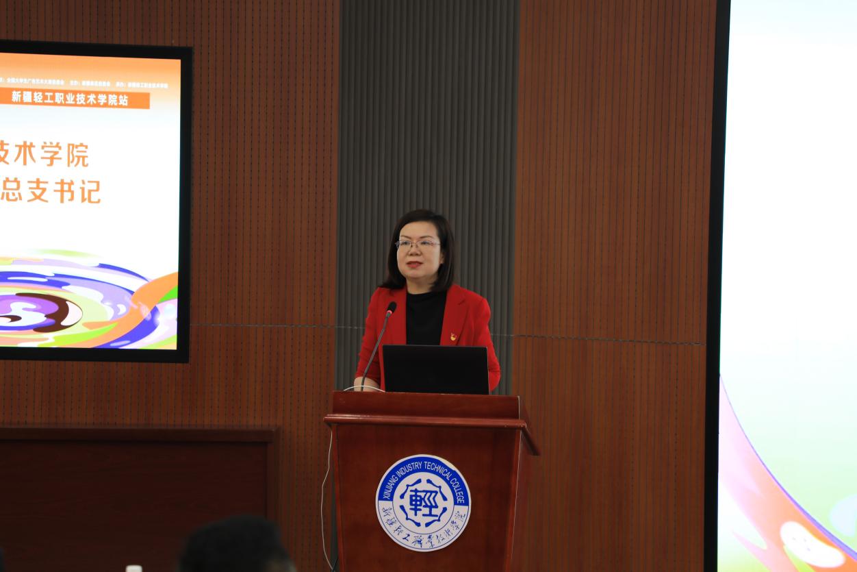 活动伊始,新疆轻工职业技术学院数字媒体学院党总支书记代莉向出席活动的嘉宾及师生表示诚挚欢迎。她从赛事意义到育人使命进行了深刻解读,对大广赛在提升师生专业素养和激发创作热情方面所发挥的积极作用给予了高度肯定,并鼓励同学们踊跃参赛,发挥专业优势,预祝本次活动圆满成功。