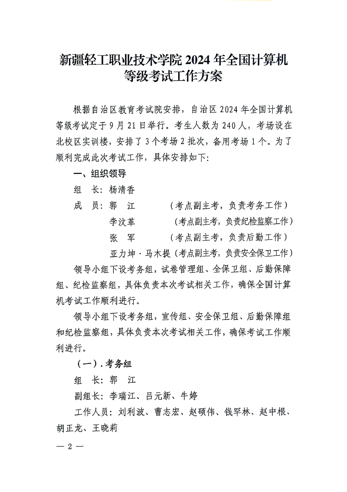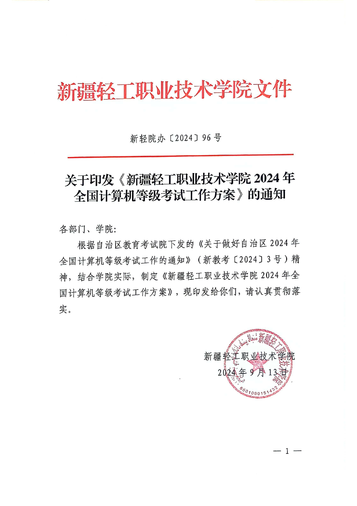 关于印发《新疆轻工职业技术学院2024年全国计算机等级考试工作方案》的通知