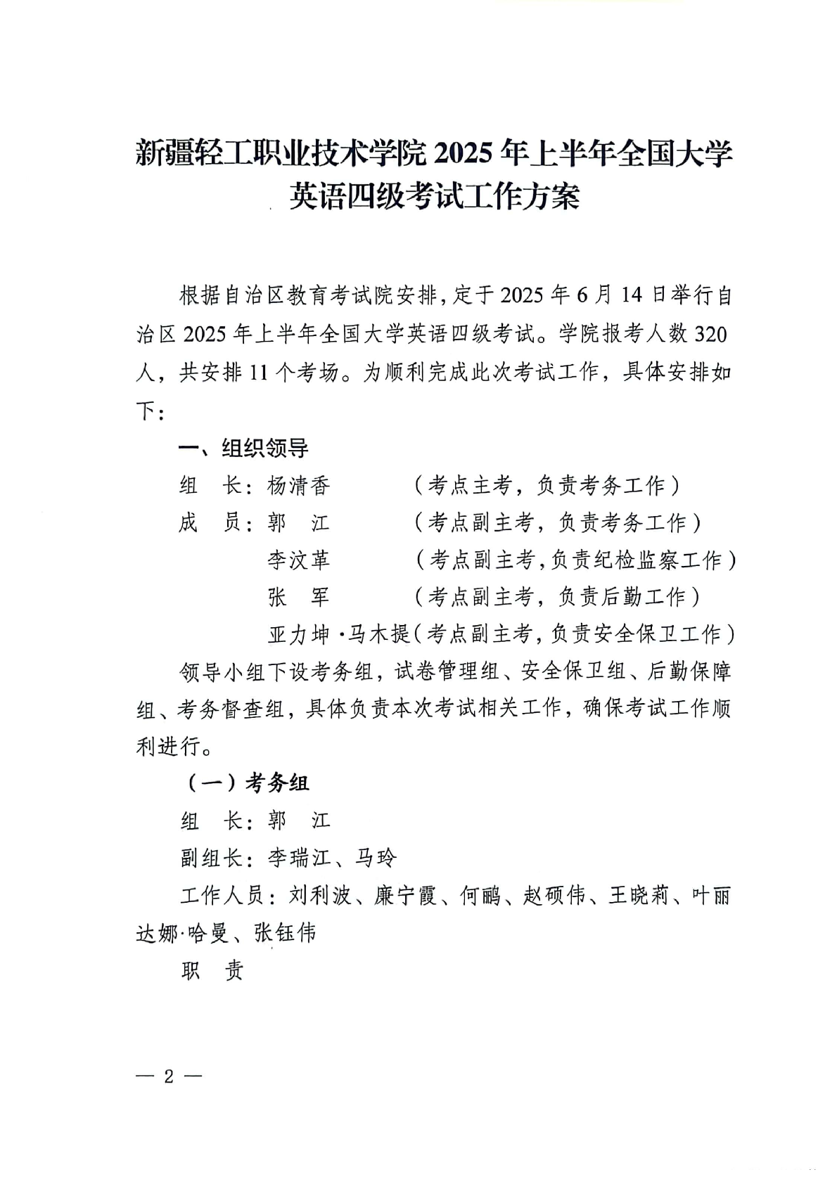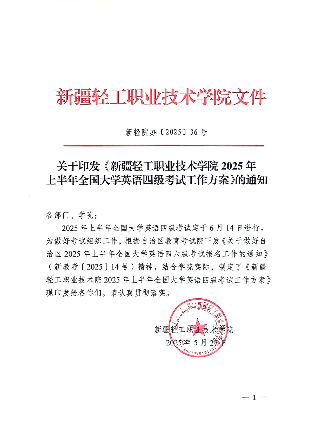 关于印发《新疆轻工职业技术学院2025年上半年全国大学英语四级考试工作方案》的通知